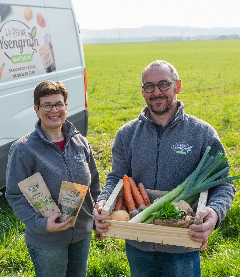Dans la continuité de leurs échanges agronomiques et d'entre-aide, les exploitations familiales EARL Sutter et Herrmann Matthieu ont souhaité partager la partie commercialisation en circuit court. C'est de cette volonté commune qu'est née la Ferme d'Ysengrain.