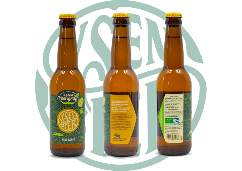 Notre bière est réalisée à la Brasserie Gsundgo, petite brasserie bio et artisanale à Echentzwiller, à quelques kilomètres de notre ferme. La recette utilise notre orge qui a été préalablement maltée chez Maltala à Bergheim et du maïs à pop corn de la ferme. Les différents partenariats ont donné naissance à une bière blonde et légère au petit goût de maïs.